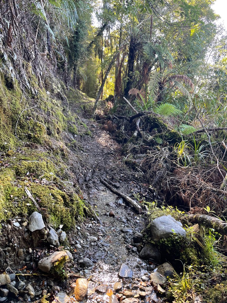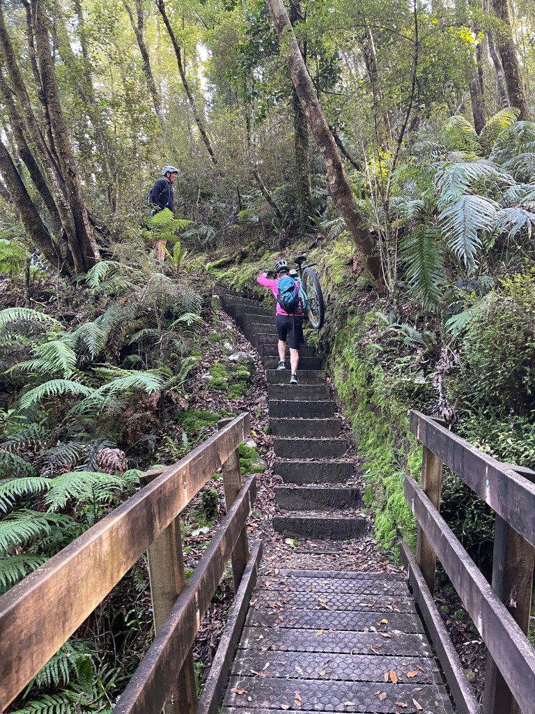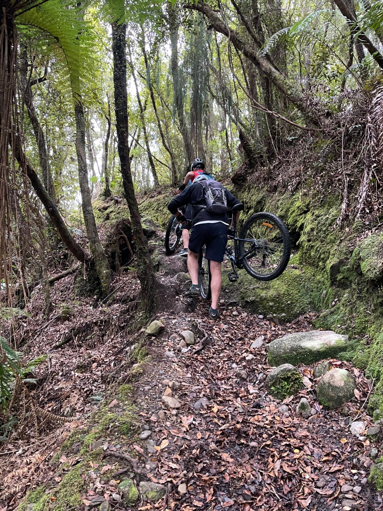 There were dips and ridges and gully’s. Dry river beds full of rocks, downed trees we had to pick up our bikes and carry over. Large tree roots which suddenly appeared ahead with the potential to thrust you over the handle bars. Embedded rocks which flicked your wheel out at haphazard angles. Narrow paths with terrorising drops (for me anyway) for us to negotiate across. And blood. In the wise words of MoD, an unforgiving track.
