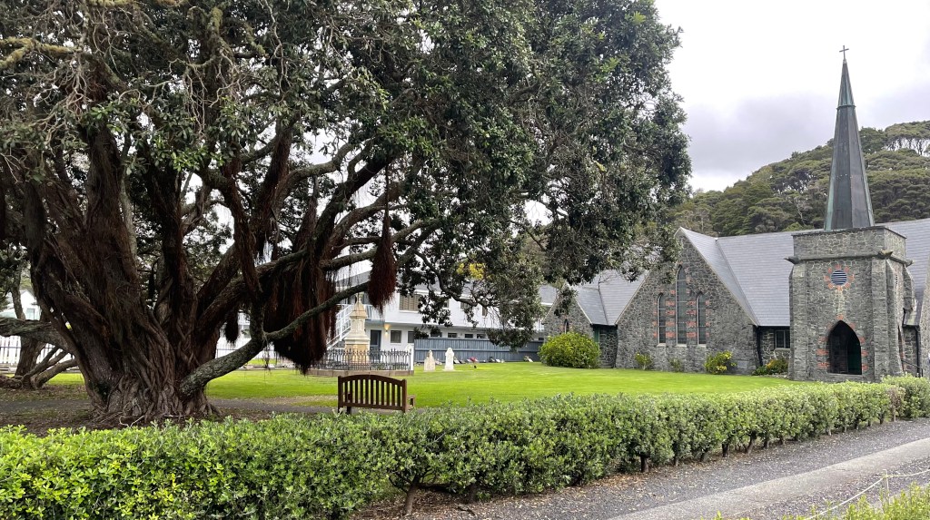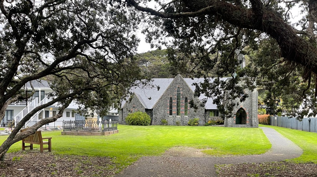 Our walk included a stop by a whale, (apparently mandatory to sit or ride on concrete animals, bit like me and swings), and a photo stop of both ‘rock art’ and the beautiful old St. Paul’s Anglican Church. The church was constructed of local Kawakawa stone in 1925 and stands on the site of the original mission church (a bullrush hut erected in 1823). It really is stunning.