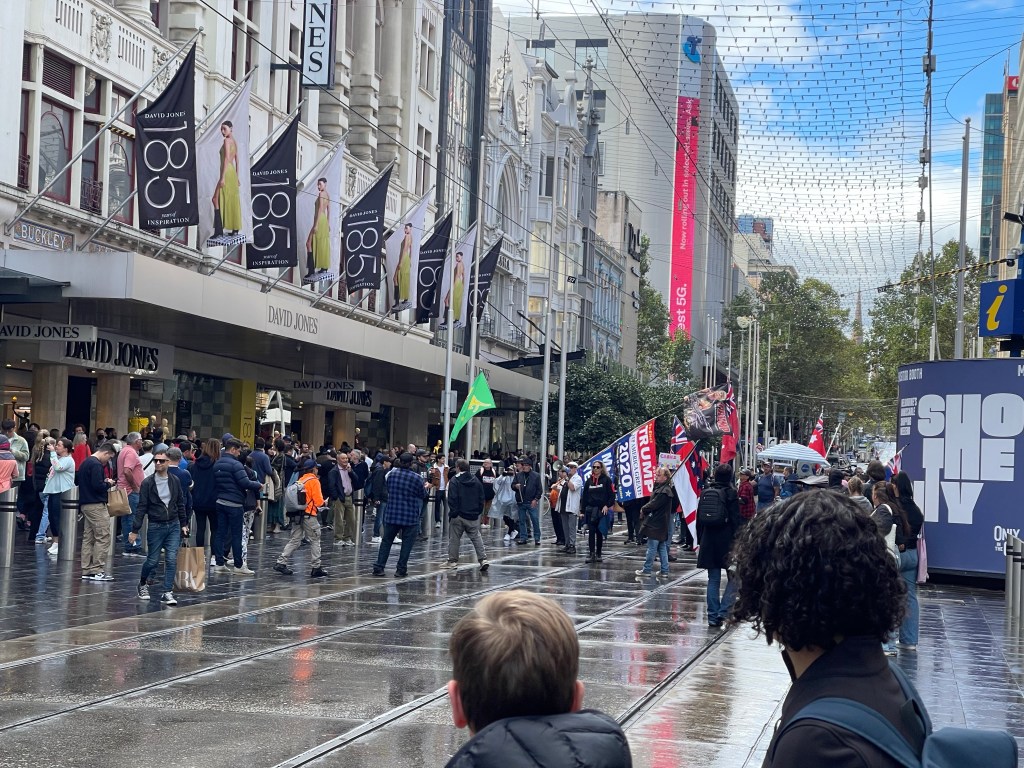 On our way to Degraves we happened upon a little rally in Burke Street Mall. Seemed it was a Trump Rally. With 2020 banners. The ‘boys’ were all ready for any trouble. But given the rally consisted of about 20 people and was pretty well outnumbered by scoffing but passive spectators I think it was all pretty safe.