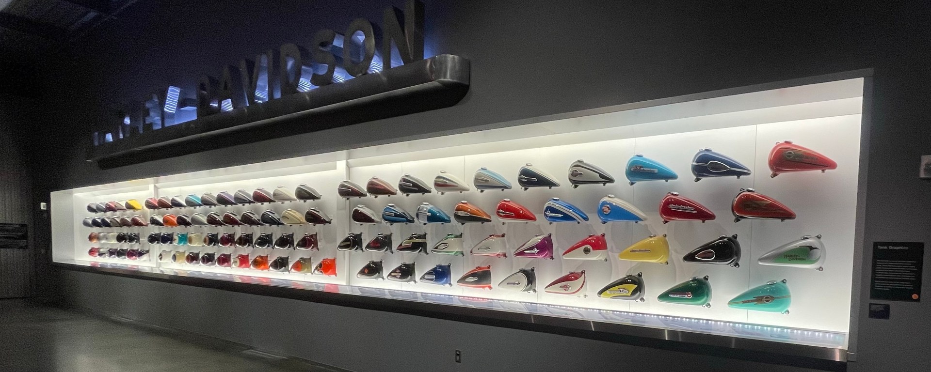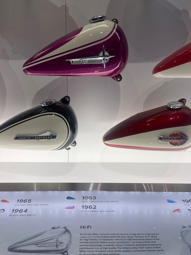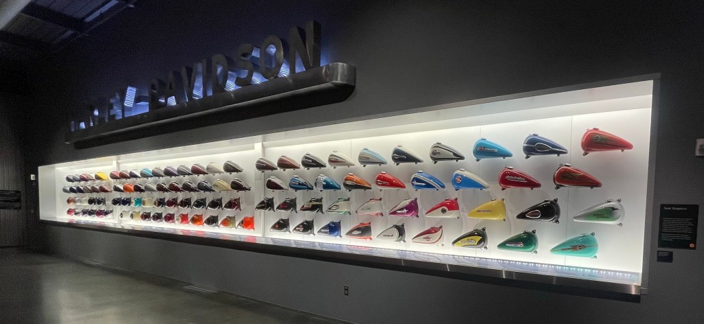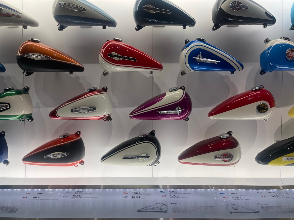 I particularly liked the wall of 100 fuel tanks which essentially showed the graphical history of the company over the last 80 years. ‘Each tank is a work of art with logo’s, paint schemes and pinstriping working together to create a visually and resonant design’. My favourite was the purple one which just happened to be my birth year.
