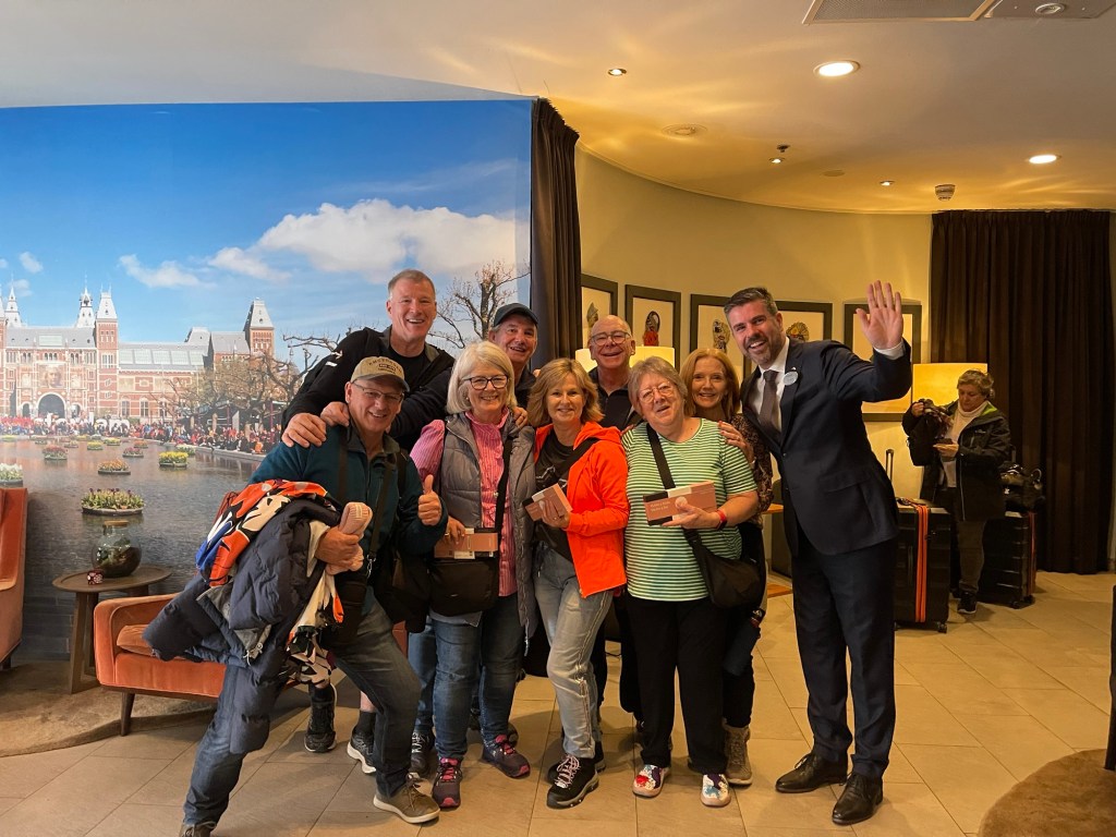 We headed back to our hotel (Swissotel Amsterdam) to pack up, only to be presented with gifts from our concierge Steven – pictured with us here.
