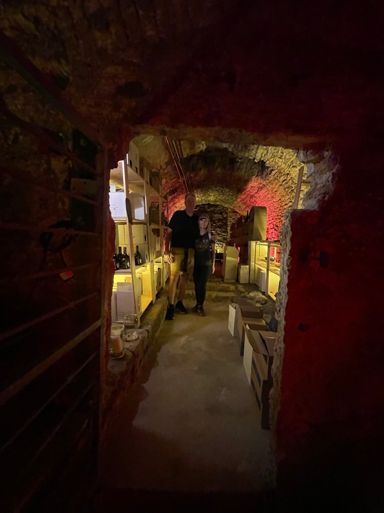 Sad to say I still don’t love the wine. Well any wine for that matter. When we went to pay, the nice bartender decided we should have a little tour of the basement. Sounded like a good idea until he took us into a ‘cave’ with a lockable door and suggested I step in with MoD and have our photos taken. Hesitation took hold. I thought of the headlines. ‘Couple from APT cruise ship disappear. Skeletons found ten years later in cellar. Appears they were used to make Sauerbraten’. MoD on the other hand pictured a scene from Pulp Fiction where they were locked in the wine cellar. Oh what the hell. You only live once….and the first cellar did have a big LOVE sign….we both stepped into the cellar. And here I am sitting on the cruise ship still alive to tell the story.