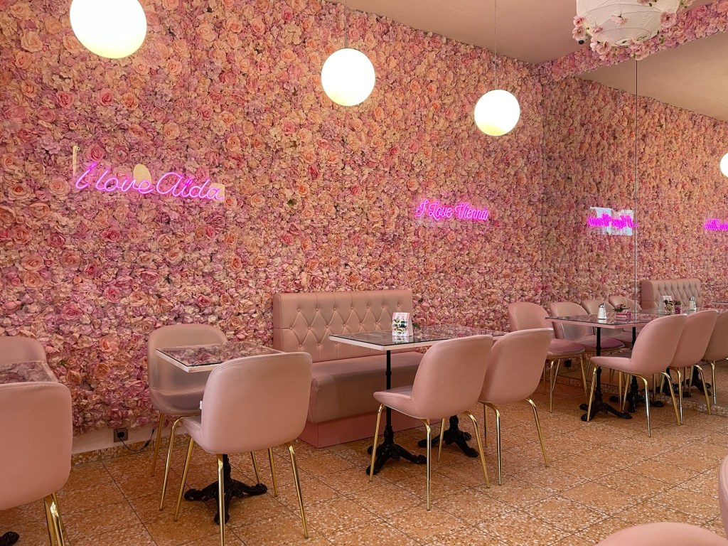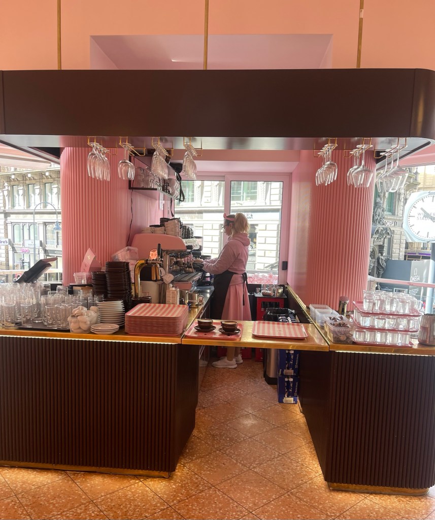 Whilst I did have my eye on the local Starbucks, of which I counted at least three, we ended up going to Cafe-Konditorei Aida-Wein which is a pretty little, everything pink, cafe/bakery in the main area.