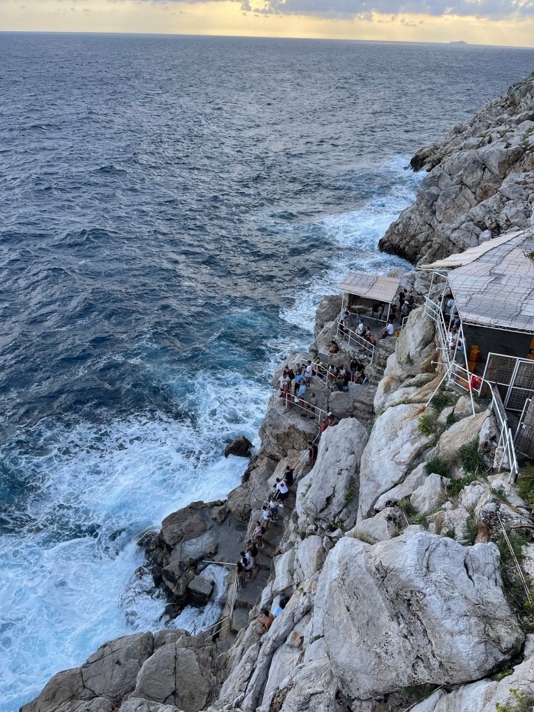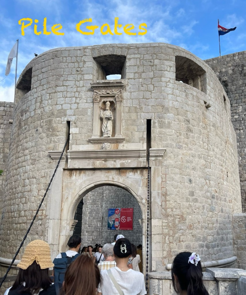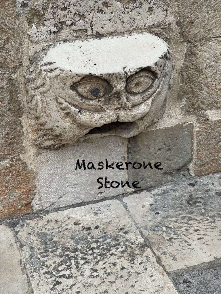 The first thing we spotted when we walked through the Pile Gate into Old Town was the Maskerone Stone…located on the wall of the Franciscan Monastery. Essentially a sculpted face/human head. According to legend, a young man could not find love so he created a ritual which has now been taken up by tourists. To find love you must jump on the Maskerone Stone with your face facing the wall, stay on it while taking off your shirt then turn around and put your shirt back on. Without falling off. It’s a vow to “win” the maskeron for a happy love……hmmmmmm…..I have nothing to say to that really. I was waiting for someone to fall and turn their ankle. That’s how us olds think.