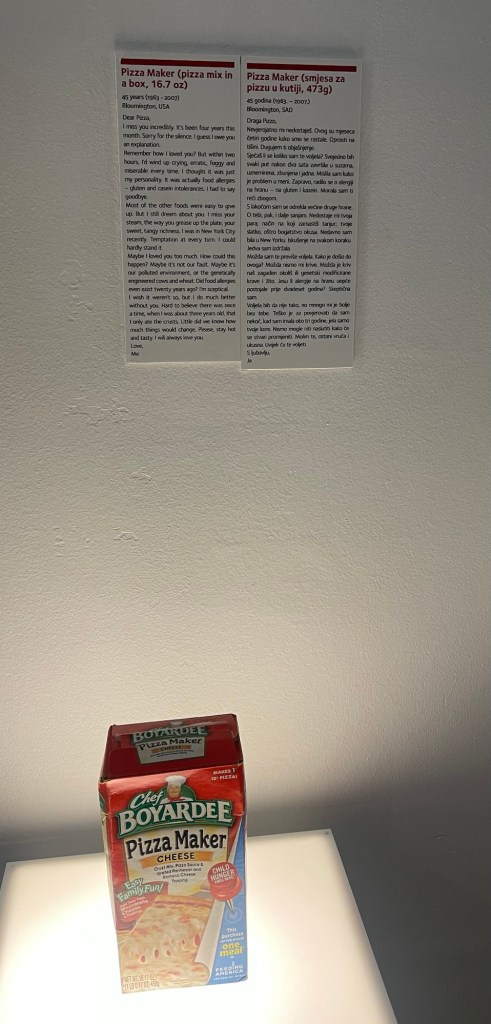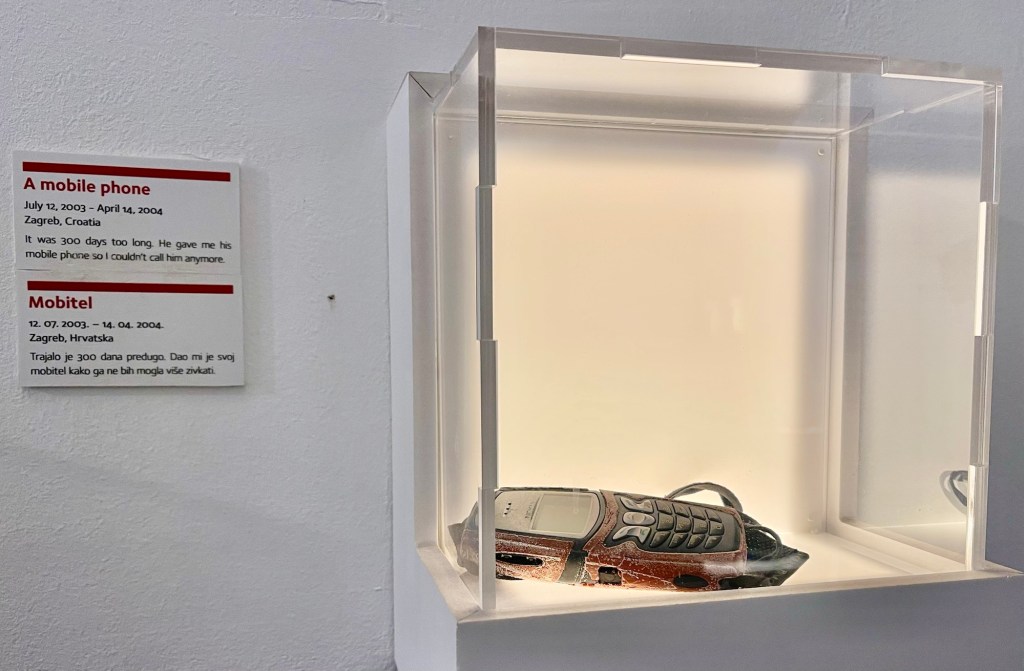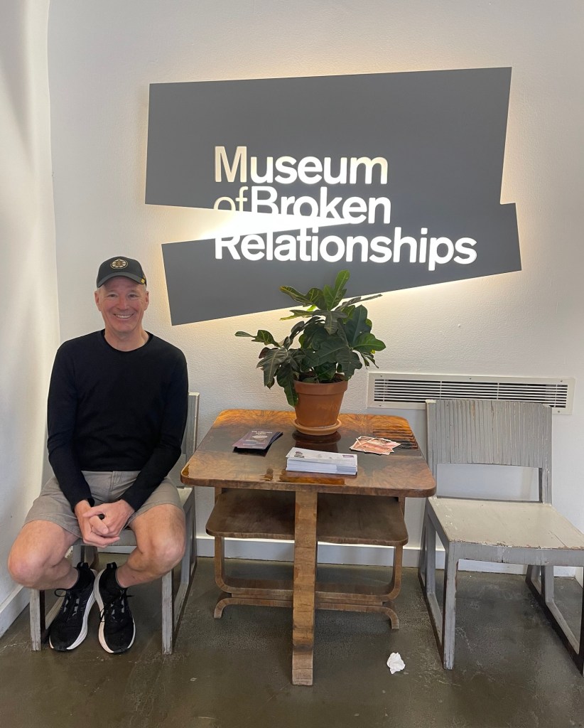 MoD had not packed his coat, much to his wife’s disgust (that’s me) so it was a rather opportune time to visit the Museum of Broken Relationships. As my SIL Lori would say ‘what a hoot’.